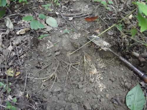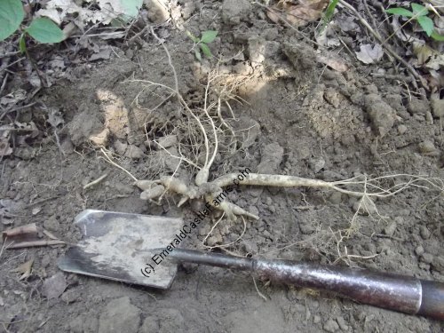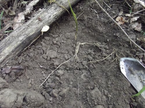 Finally, the whole ginseng root is loose and can be gently lifted from the soil. Notice all the fine roots are intact and not broken off from trying to force the root out of the ground with the digging tool.