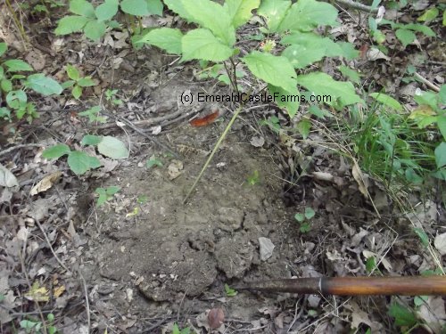 Now, start to loosen the dirt well away from the place where the ginseng stem comes out of the ground. We don't know which way the root runs yet, and we don't want to damage it. So, push in your trowel and gently pry up just enough to start to loosen the soil.