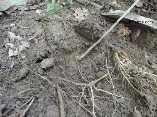 Eventually, we carefully work our way into the stem until we expose the neck of the ginseng root. Notice all of the other roots we have uncovered without damaging them with our digging tool?