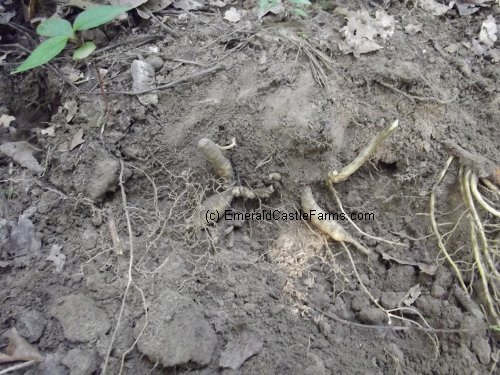 Continue to work the loosened soil away from the root of the ginseng plant. Never try to pry or pull the root out of the ground. Instead, gently loosen the soil around it, uncover it, and then gently slip it out of the ground without forcing it. If anything sticks, you need to loosen more dirt out around the root. Notice a couple more tubers have come into view.