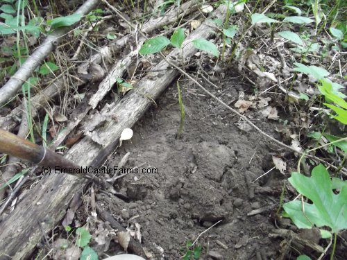 Remove all the ground litter so we can get a good idea of where the stem comes out of the ground. At this point, I often snap the top off and either bury it nearby or keep it for some friends who make tea with the tops I find. (I left this one on for a while).