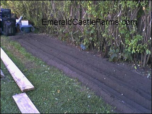 The first step is to decide on a location for your bed. In the picture below, you will see the location of the beds next to a tall hedge row. The hedge is on the west side of the new beds. Next, we decided to till up the ground under the new raised beds.