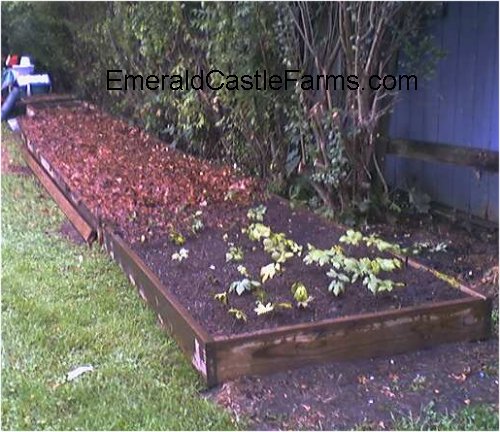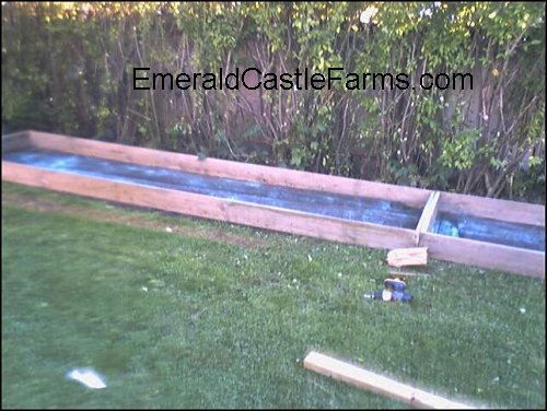 In this case, each of the beds will be four feet wide and sixteen feet long. Set the sides of the beds in place and fasten them together. We are using a special self-taping torx head screw specifically designed for decking material. We are also using treated 2 x 10 lumber for the sides. Note also that we have sprinkled some Kocide (metallic copper) fungicide over the bottom of the new beds.