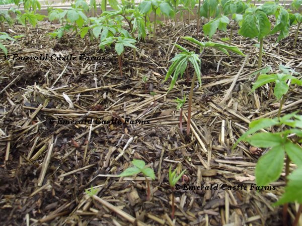 The picture at the top of the page shows a bed of two year SELECTs where a thousand roots were dug in such a way as to separate the bed to help control disease should it occur. As you can see clearly in this picture, it looks like I reseeded this spot. But, in fact, those are all seeds which did not germinate on time, but rather delayed a year -even though germination was outstanding the year prior. The next year, the entire bed was emptied and goldenseal was planted back. Now, the second spring after planting the goldenseal, I'm still seeing ginseng seedlings emerge from that bed.